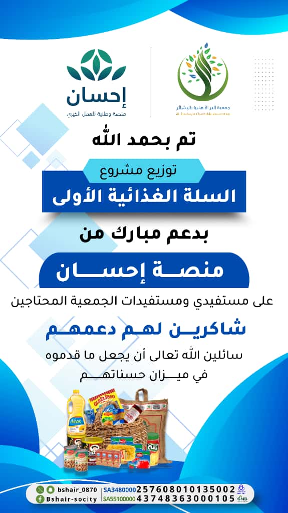 قامت جمعية البر الاهلية بالبشائر بتوزيع السلة الغذائية الاولى وذلك بدعم مبارك من منصة احسان للمحتاجين والمستفيدين والمستفيدات من الجمعية شاكرين لهم دعمهم سائلين الله تعالى ان يجعل ما قدموه في ميزان حسناتهم