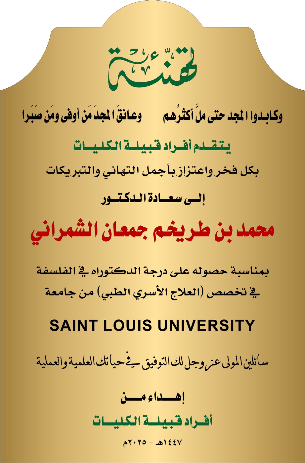 اقام افراد قبيلة الكليات الفزع شمران بالرياض حفل تكريم للدكتور محمد بن طريخم بن جمعان الزاهري الشمراني (الفزع تبالة)وذلك بعد حصوله على درجة الدكتوراه في الفلسفة في تخصص ( العلاج الاسري الطبي ) من جامعة saintlouisunivrsity الامريكيةوقد قدمت خلال الحفل الهدايا التذكارية بهذه المناسبة .