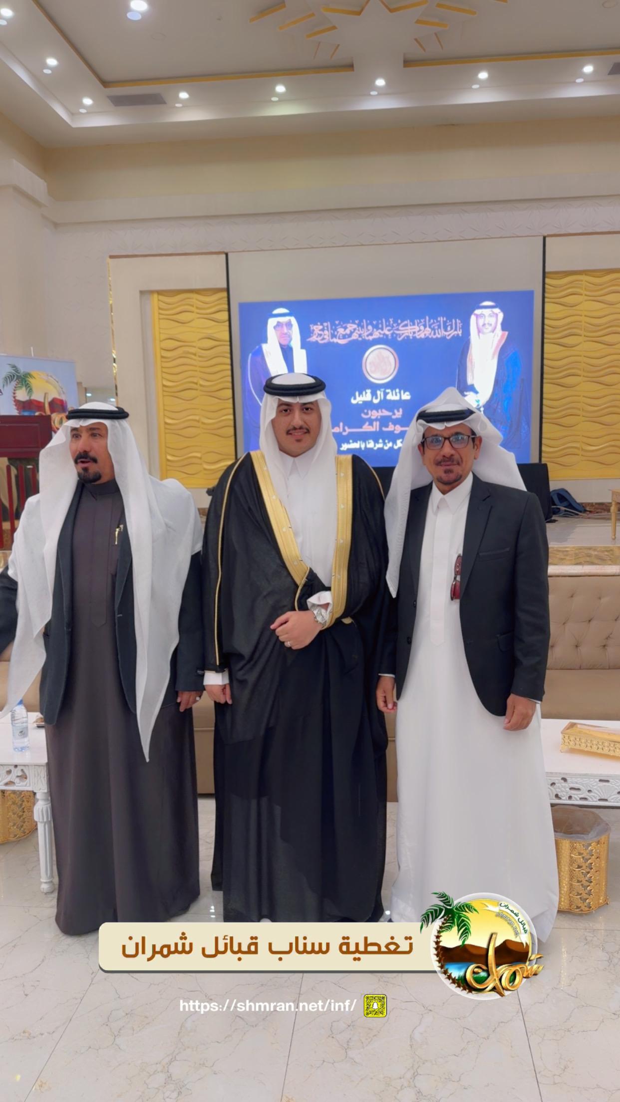 نبارك للمهندس/ احمد بن علي بن خلف آل قليل الشمراني ( شمران تهامة _ قرية غدنه) بمناسبة زواجه على كريمة الاستاذ/ عبدالله بن خلف بن صهبان ال خليفة الشمراني بارك الله لهما وبارك عليهما وجمع بينهما بخير وذلك بالقاعة الكبرى بمدينة ابها بمنطقة عسير .